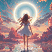 a fantastical scene with a girl standing at the edge of what appears to be a body of water, facing away from the viewer. She is dressed in