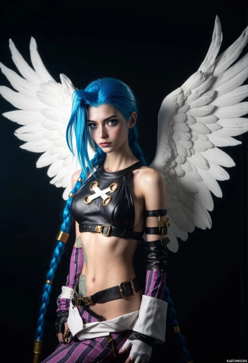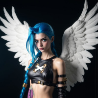 a young woman with blue hair styled in twin braids, wearing white wings on her back and holding a sword. She has a muscular build and is dressed in a black leather bodysuit adorned with