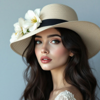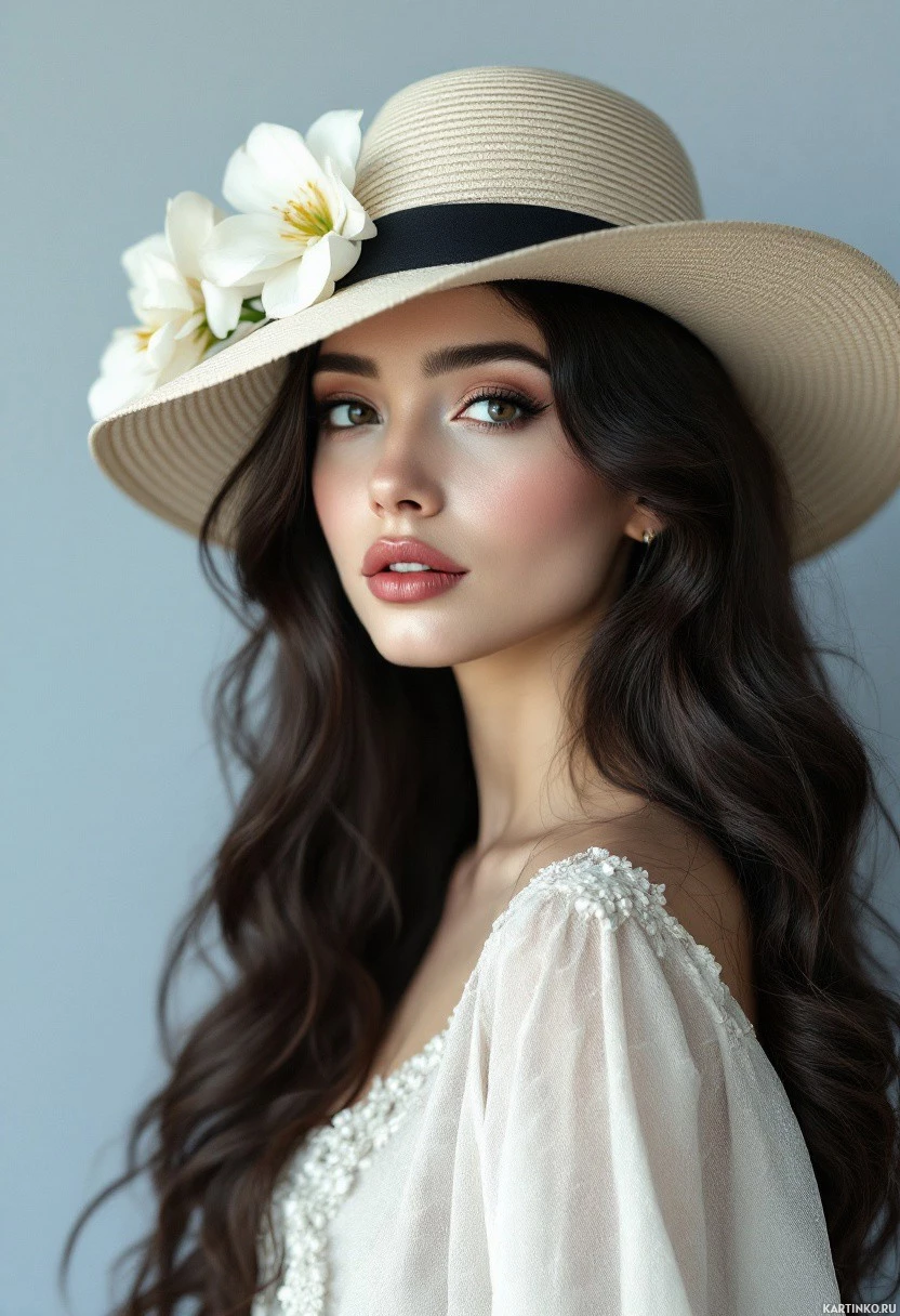 wavy hair and is wearing a light-colored hat with a darker ribbon around it. Her makeup includes