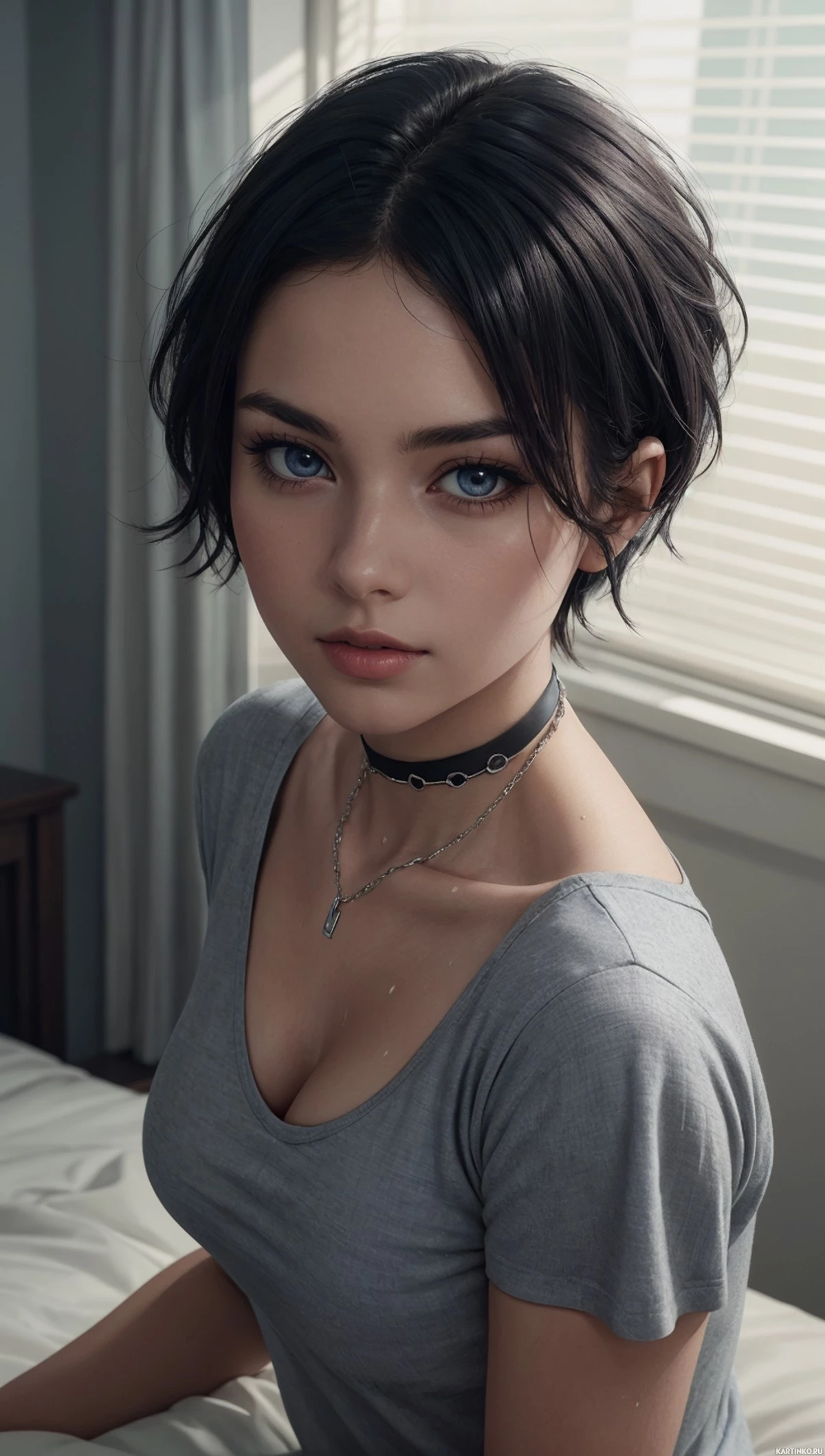 blue eyes and is wearing what appears to be a casual outfit consisting of a grey top or tank top. Her expression is neutral with her lips slightly apart as if she's not smiling but is posing for the photograph. The setting suggests