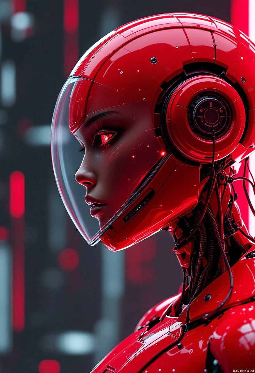 a female character with red-colored robotic armor. She has a sleek, metallic appearance with detailed mechanical elements such as the joints and structural design on her torso. Her head is encased within a transparent visor, giving her an advanced,