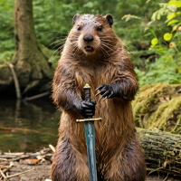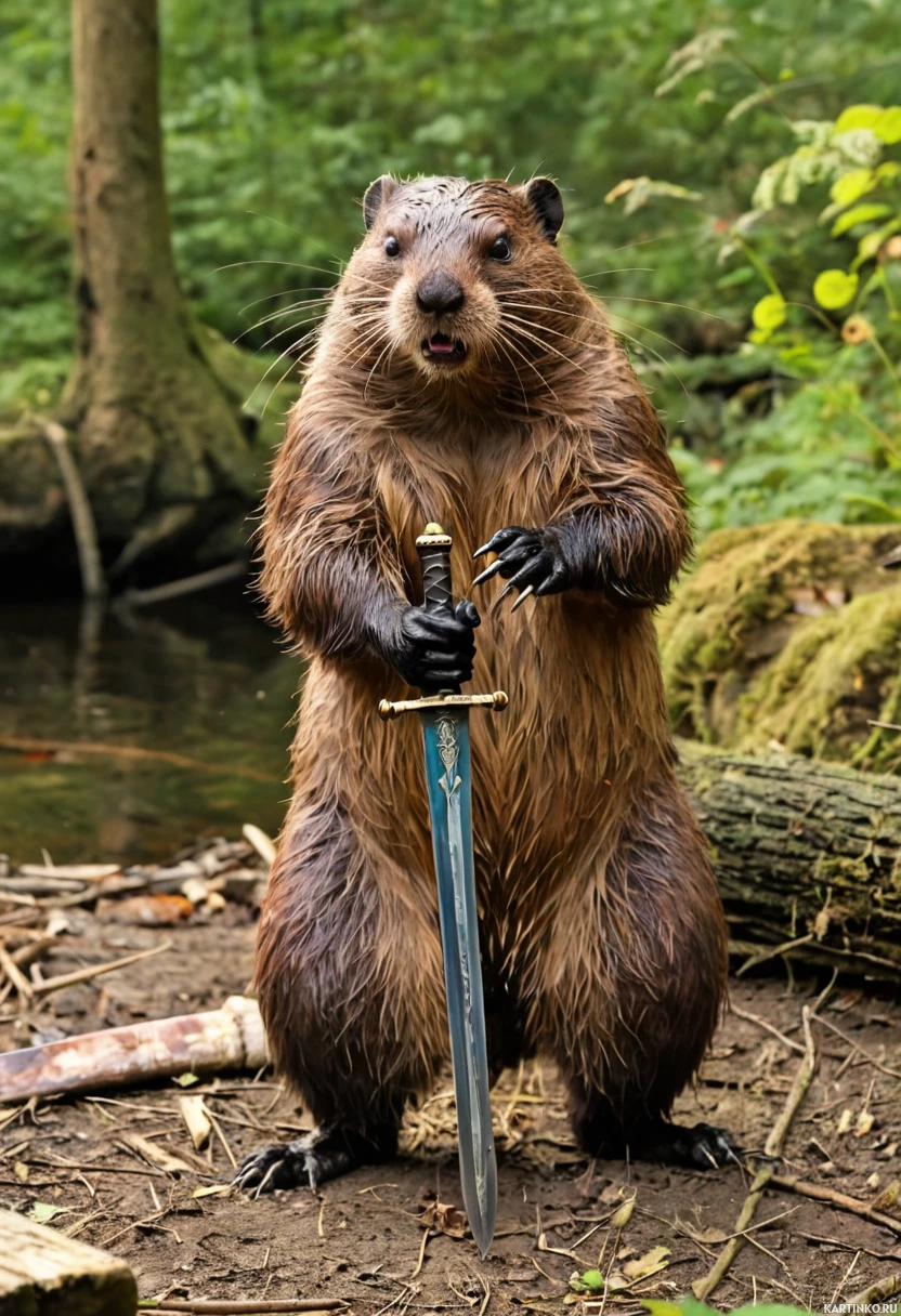 front paws, with the blade pointing towards the ground and the beaver's body. The beaver has its mouth open as if it is roaring or shouting. The background suggests