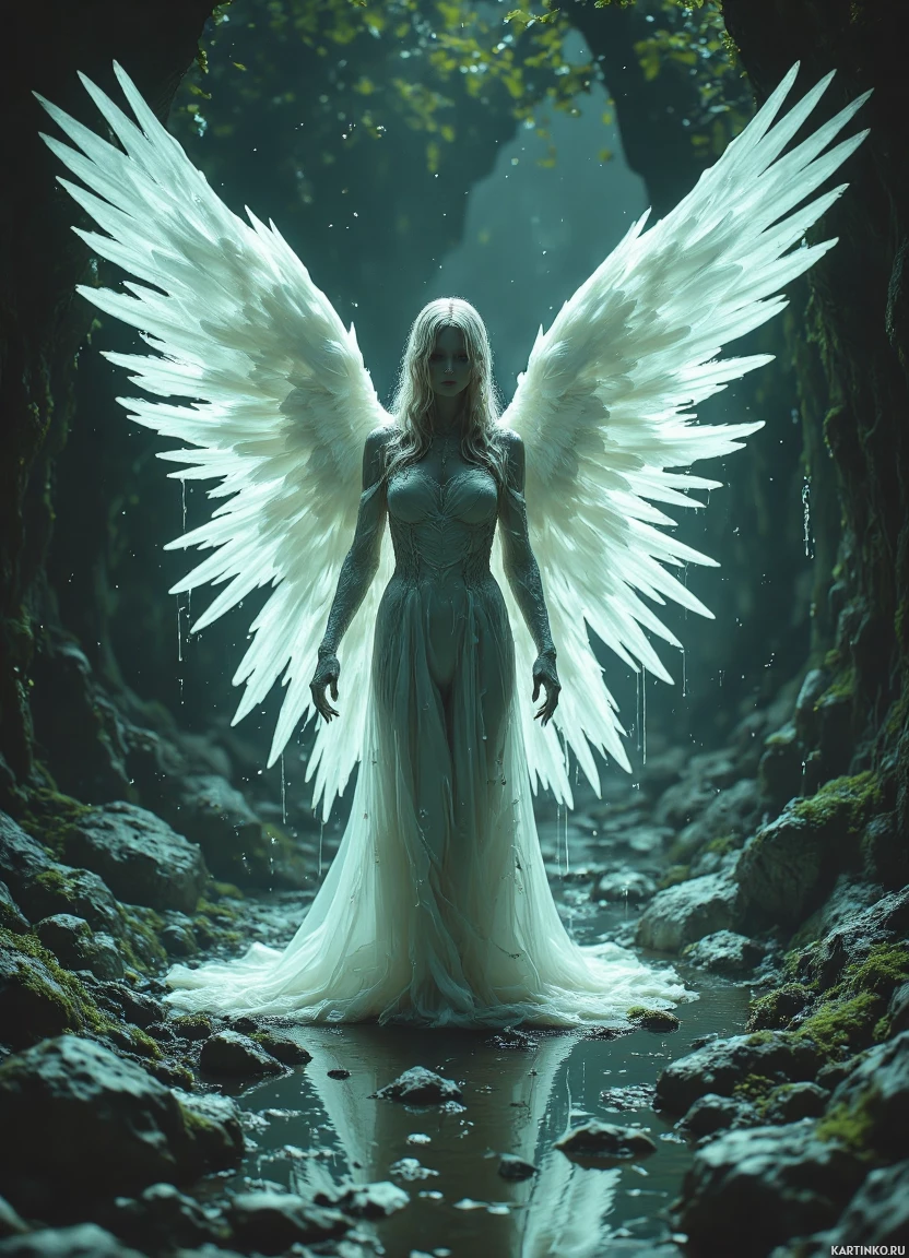 white hair and wings, resembling an angel. She is standing in what appears to be a cave-like setting, possibly an underground cavern, given the mossy walls and