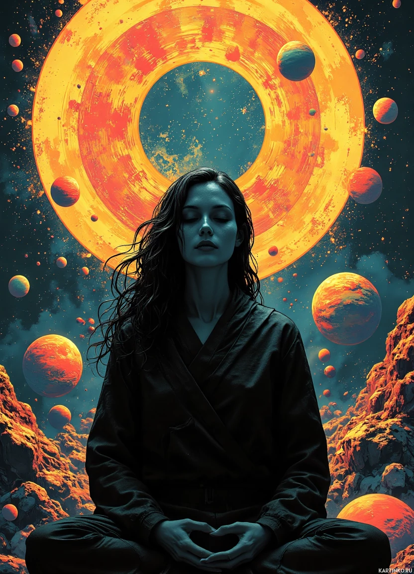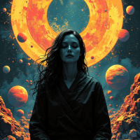 celestial bodies like planets and stars, which could represent the universe or a cosmic setting. The color palette is dominated by