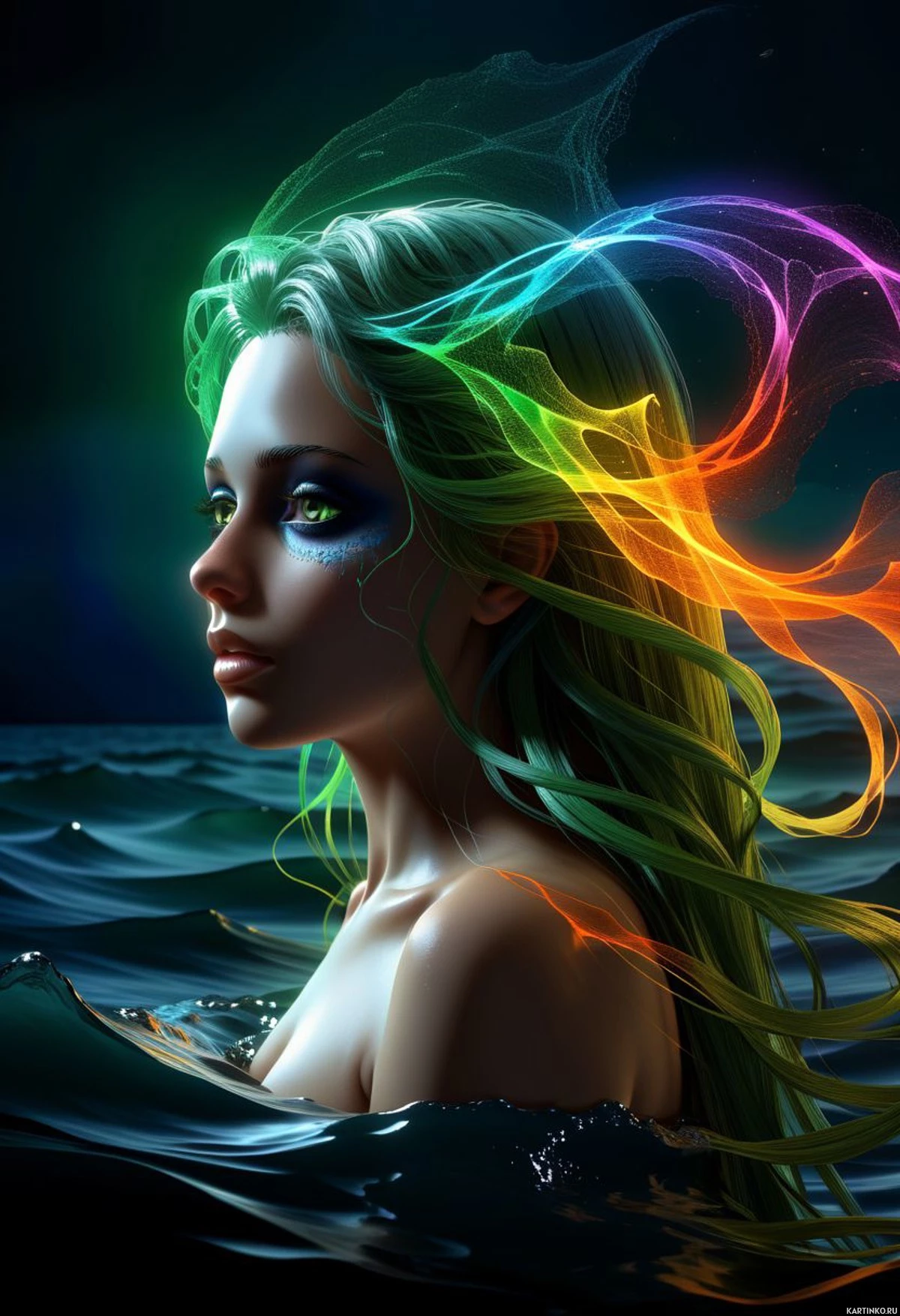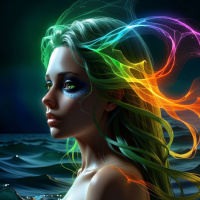 flowing hair. The individual's head is adorned with vibrant streaks of color that resemble rainbow or