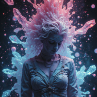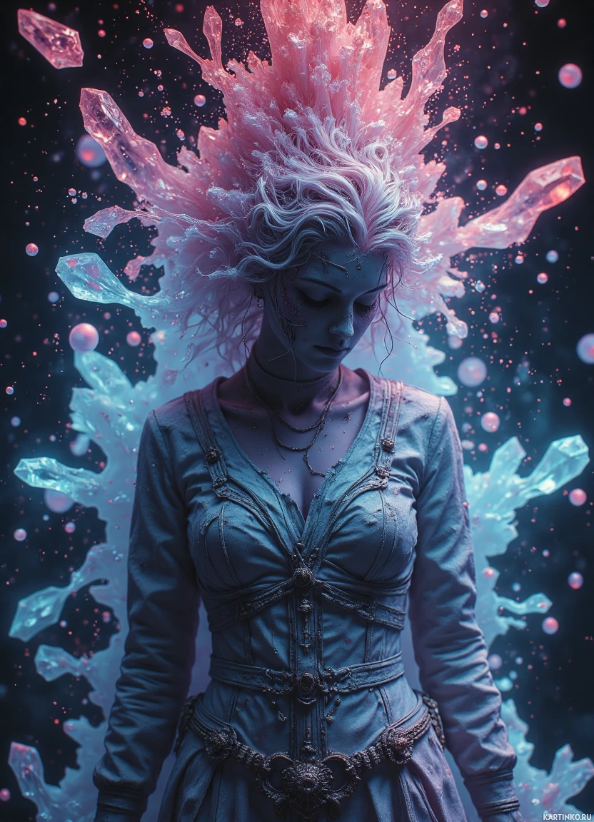 light hair that floats around her face and what seems like ice or crystalline structures forming her hair, adding an ethereal quality to the scene. The backdrop is a dark space filled with vibrant pink and blue lights, which could be interpreted as swirling energy or particles, enhancing