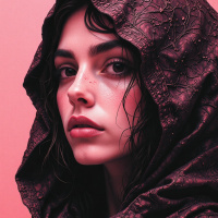 fair skin and has striking features such as defined eyebrows, dark eyes, and full lips that suggest they may have lipstick on. Their hair is styled in a way that it falls over their face, partially obscuring the view of their