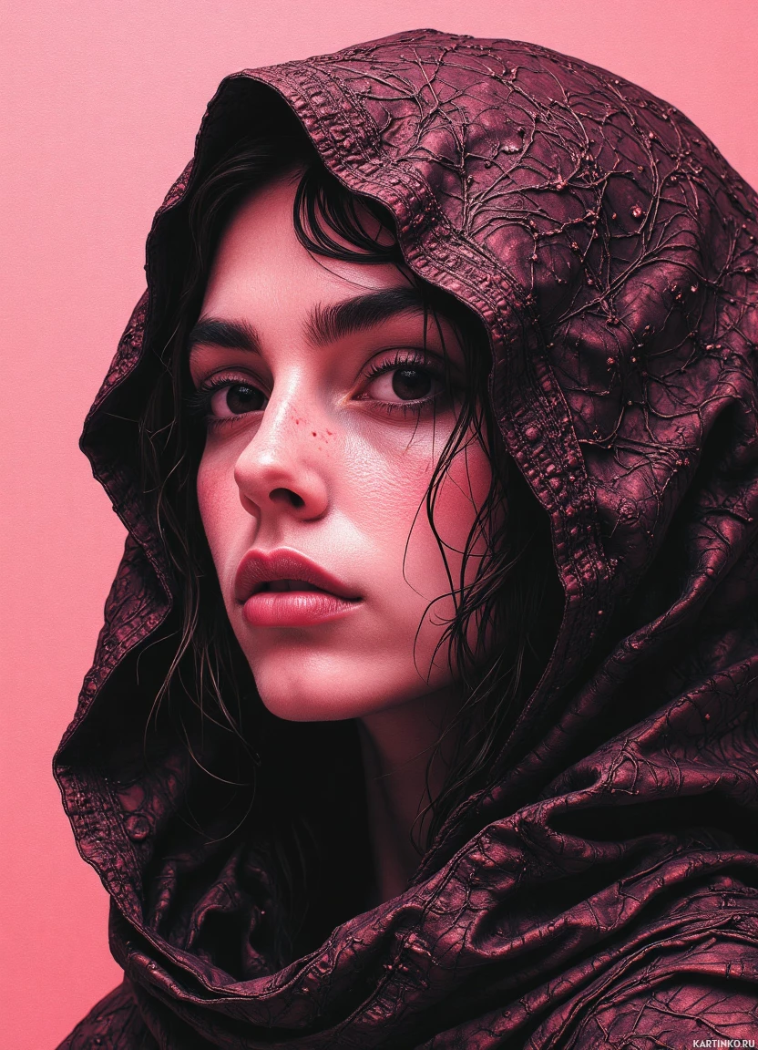 a gradient effect, fading from a bright magenta at the top to a lighter shade near the bottom; the lower half is beige and seems to have a textured appearance that could be an overlay or filter applied post-photographically. The style of the image is reminiscent of fashion photography, characterized by its vivid colors and focus on the person's attire and expression. The lighting in the photo highlights the individual's features while casting soft shadows on their skin.