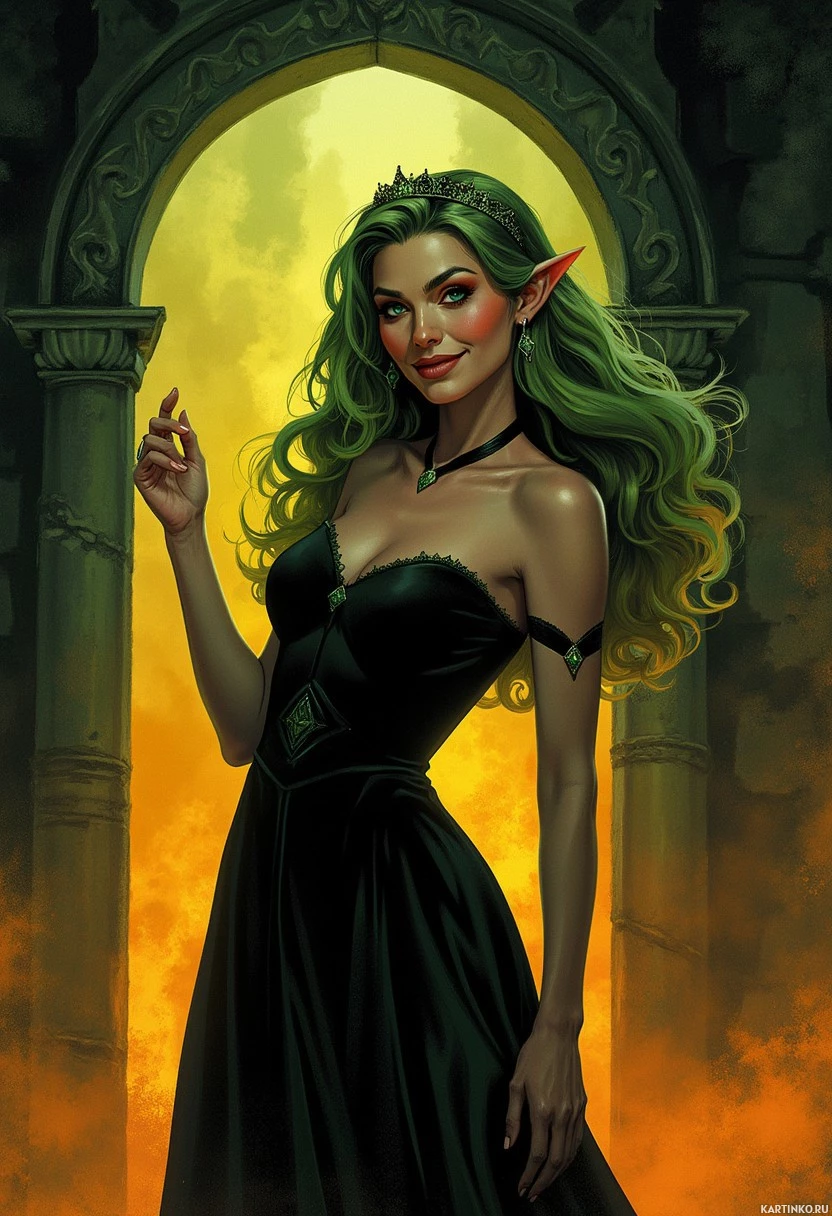 a black dress with lace accents, and she has a necklace on. Her expression is somewhat mischievous or confident as she tilts her head to the side. Behind her is an archway that appears to be made of stone, and there's a fiery glow emanating from behind her, suggesting some sort of