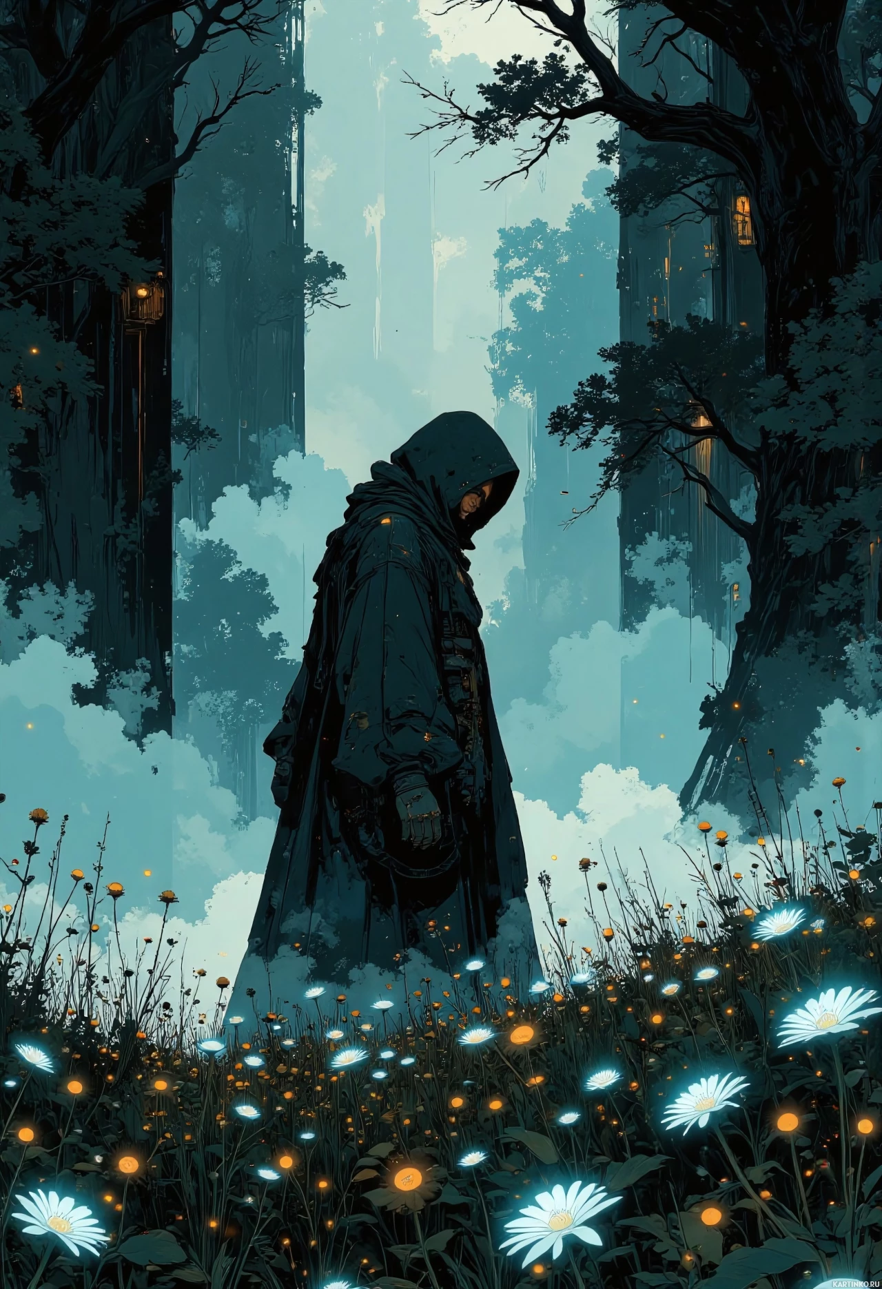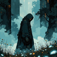 forest scene. A figure, possibly male given the attire and hairstyle, is standing on