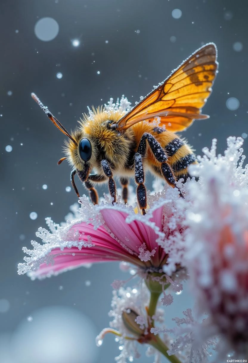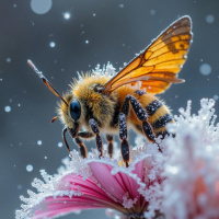 a pink flower. The bee has yellow and black stripes, characteristic of many species, and it appears to be covered with snowflakes, suggesting that the photo was taken during a snowfall or in an area experiencing