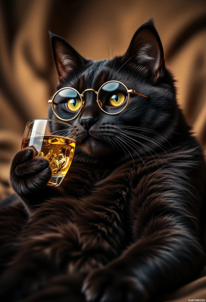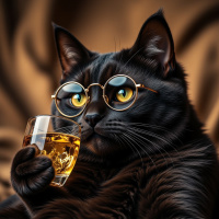 a black cat with yellow eyes, wearing glasses. The cat is holding a small glass filled with what appears to be