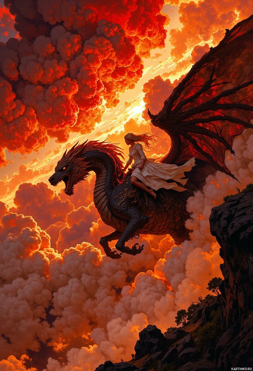 a sense of adventure and wonder to the scene. The setting seems to be high above an erupting volcano, with the fiery clouds filling the sky, enhancing