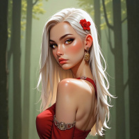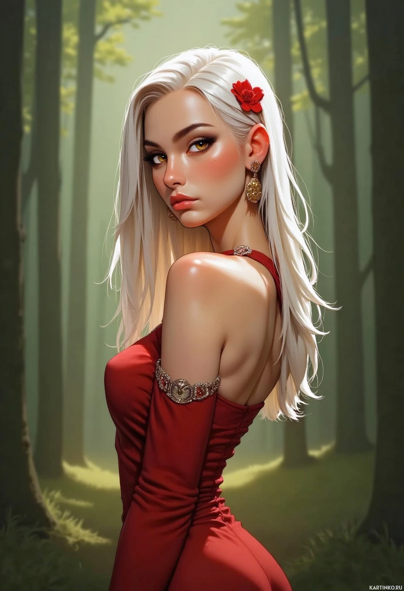 blonde hair styled in an elegant manner, with a single red flower on her right side. Her makeup is accentuated with pink and nude tones, giving her a soft and sophisticated look. She wears