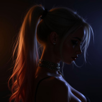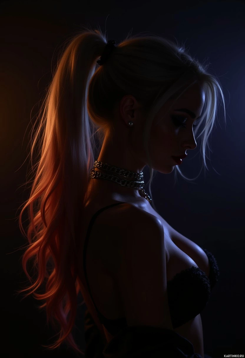 blonde hair styled in pigtails and is wearing what appears to be a black bra. Her pose suggests she might be leaning against something or someone, although her attention is directed downwards. The lighting gives the image an intimate, perhaps late-night atmosphere.