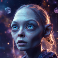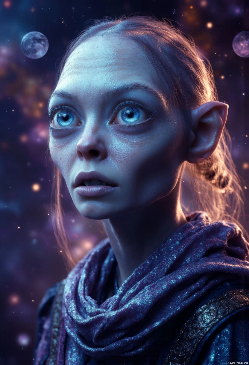 elongated ears and skin that appears wrinkled and pale, which are characteristic features of Gollum as portrayed in the movies based on Tolkien's works. The background suggests a cosmic setting with stars visible, possibly indicating that this scene is taking place in space or near