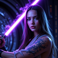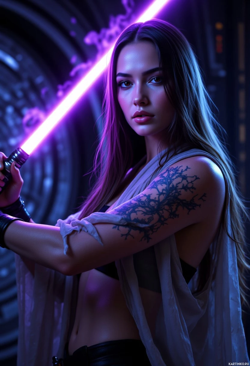 an iconic weapon from the series. Her attire and pose are reminiscent of characters from the movie universe. In particular, her outfit and posture might evoke the image of Rey,