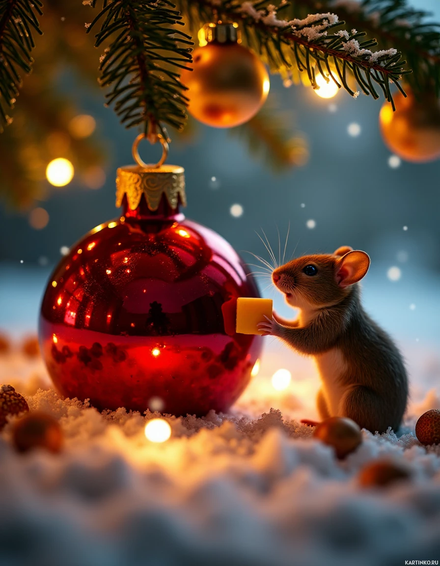 a small mouse or rat engaging with a Christmas decoration. The mouse is standing on its