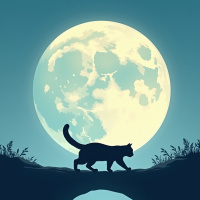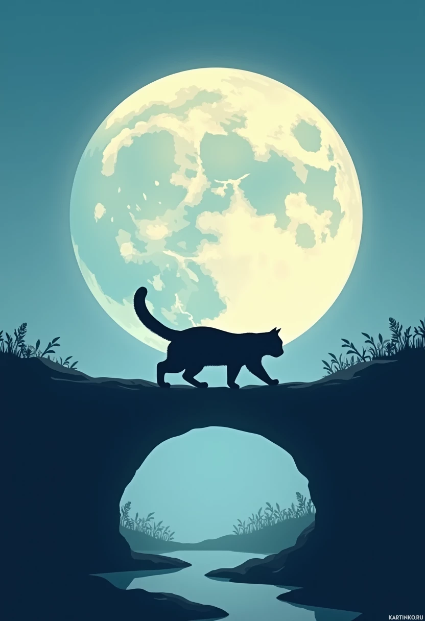ambiance of the scene. The image evokes a sense of tranquility and solitude, as the cat seems to be alone in this picturesque landscape under the moonlit sky.