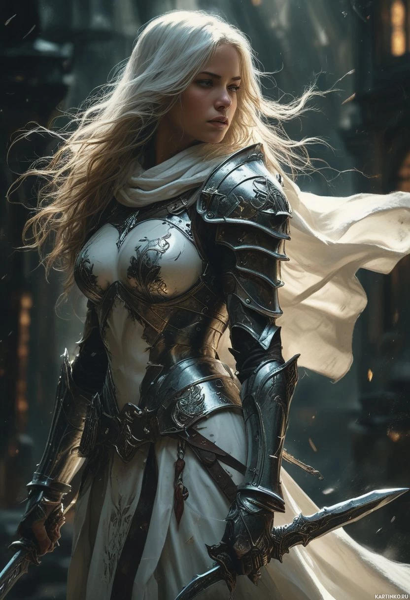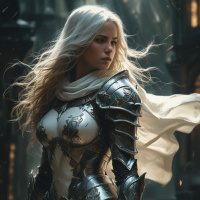 white hair, and her attire consists of armor that includes a helmet with what appears to be a visor or mask covering the lower part of her face. The armor is ornate, suggesting she might be of
