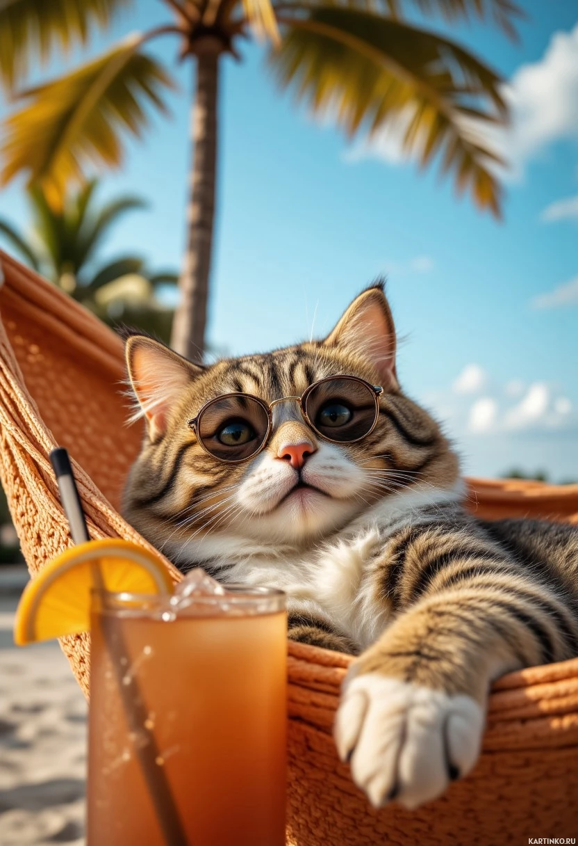 a hammock on a beach. The cat is wearing sunglasses and appears to be enjoying
