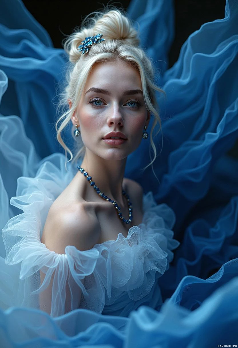flowing dress with a blue hue and sheer fabric textures. Her expression is neutral and poised. Around her neck, there are delicate pearl strands and