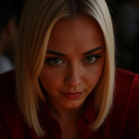 a soft glow on her face. The setting seems to be indoors, possibly at an event or gathering given the presence of what could be another