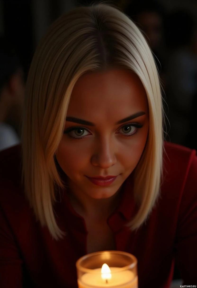 a pensive expression and is gazing off to the side. In front of her is a candle that appears to be lit, casting