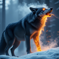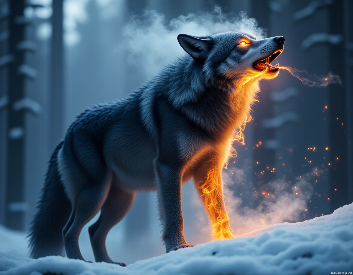 snowy ground, with fire emanating from its paws. The setting appears to be a forest covered in snow during winter or early spring, given