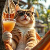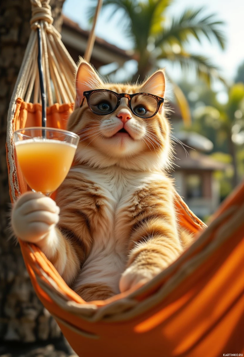 a relaxed vibe, with ropes supporting it and a small spreader bar at the foot end, typical of a human hammock. The cat's paws are extended towards an object that resembles a cocktail glass filled with what looks like