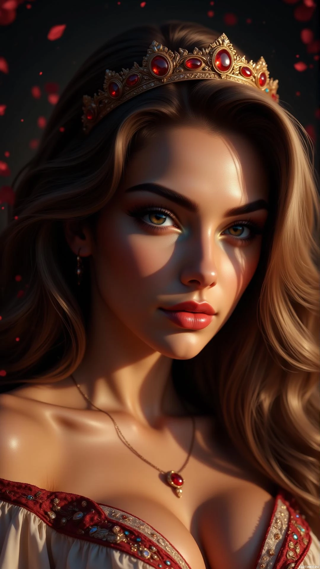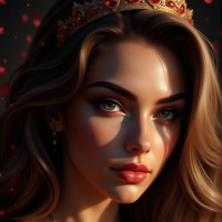 a fair complexion, wearing a golden crown adorned with red gemstones. She has long, light-colored hair and is looking directly at the viewer. Her