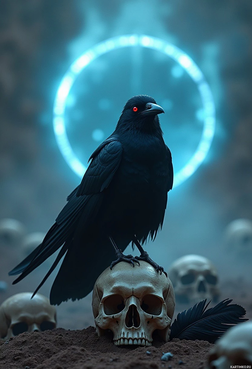 a black crow perched on top of what appears to be a skull. The skull is positioned in front of the bird, and there are other skulls scattered around it, suggesting a scene that might be associated with death or decay. In the background, there's an illuminated blue circle that could be interpreted as a symbolic representation of a portal or
