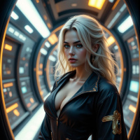 blonde hair styled upwards and is wearing an outfit that seems to have a military or space theme, featuring dark colors with gold accents. Her