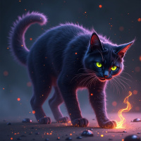 molten rock, surrounded by small rocks and embers that are glowing red and yellow. The cat's fur is dark and it has