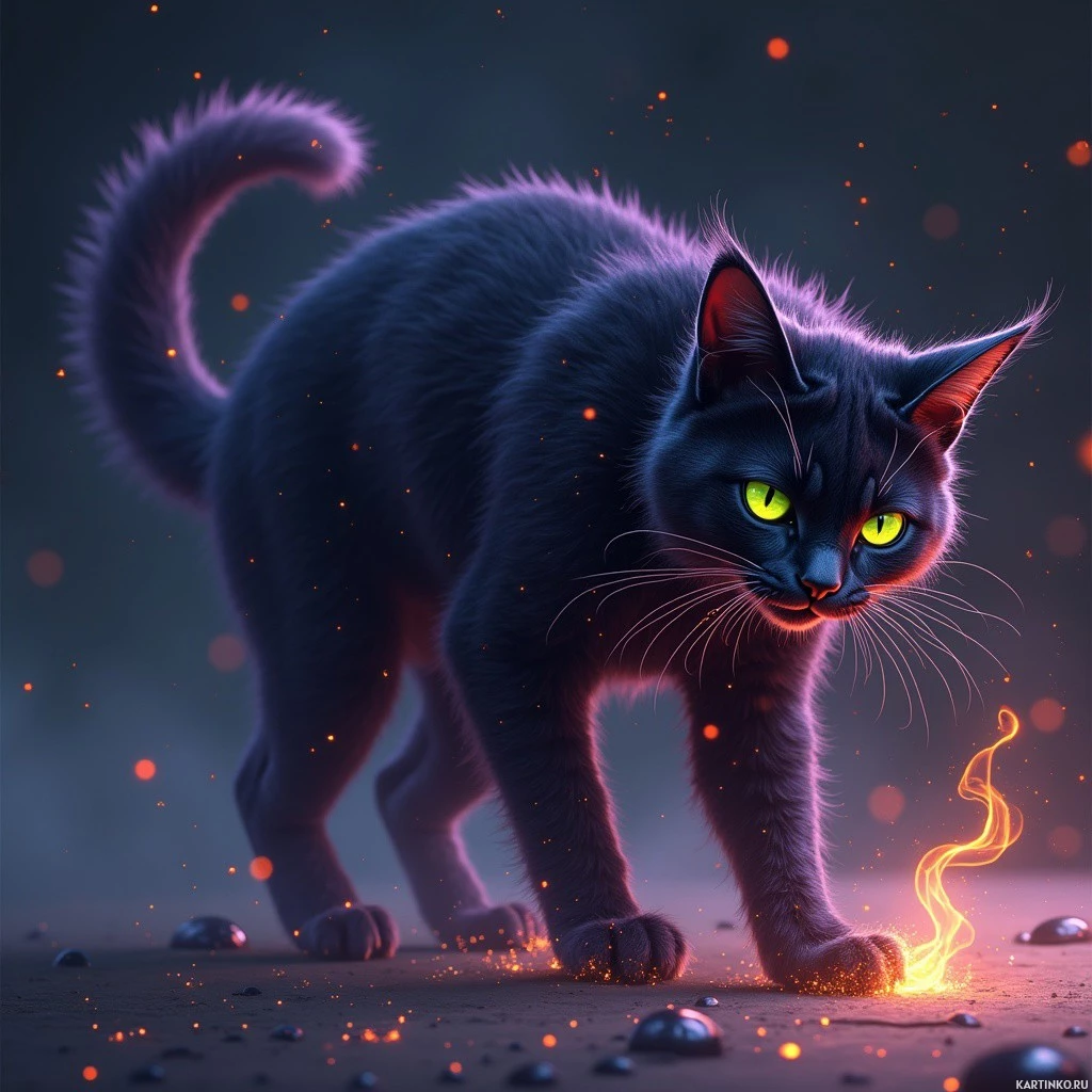 green eyes. It appears to be standing on what looks like hot lava or