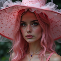 pink hair and makeup that enhances her features. She is wearing a large, decorative sun hat with