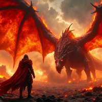 volcanic terrain due to the presence of smoke and lava flow. The warrior is dressed in a cloak and armor, standing resolute in front of the dragon, seemingly prepared for combat. The overall atmosphere conveys
