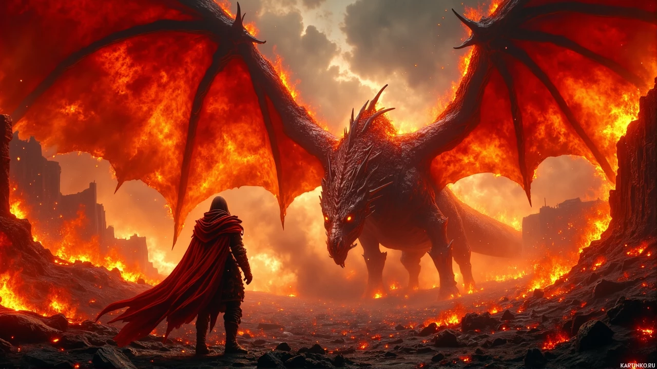 a fantasy scene featuring a warrior standing in front of a dragon. The dragon is a large creature with