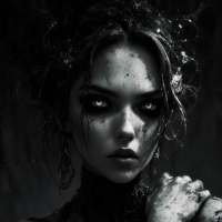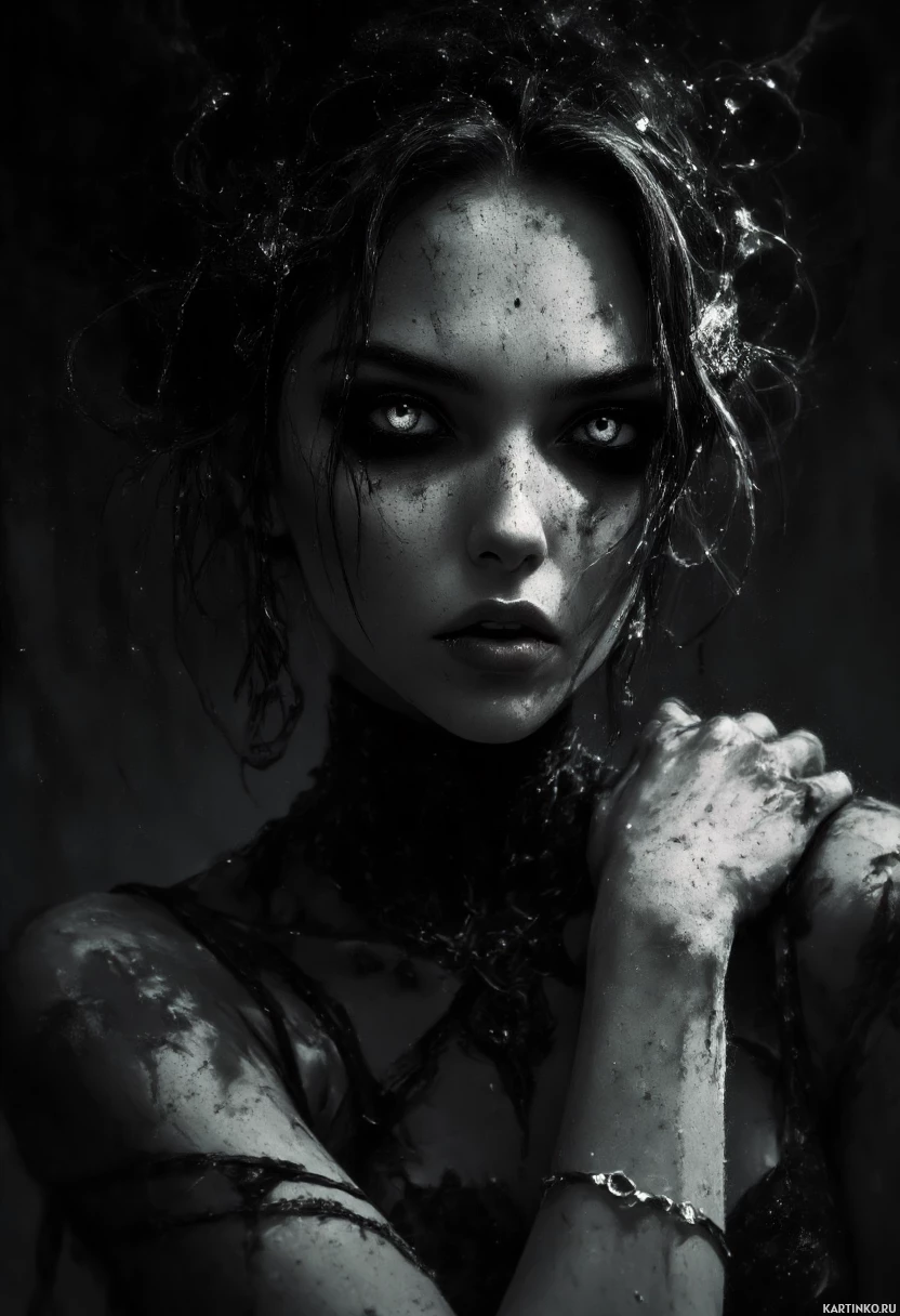 large eyes and sharp cheekbones, giving her an intense or ethereal appearance. She has markings or bruises on her neck and shoulders, and her skin appears to be covered in some kind of substance, possibly dirt or mud, which adds