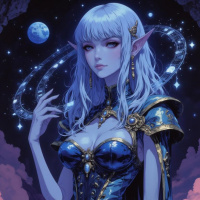 a night sky with stars and a crescent moon in the top left corner, suggesting a setting that could be interpreted as magical or fantastical. The overall artwork is detailed, with attention to shading and texturing that conveys