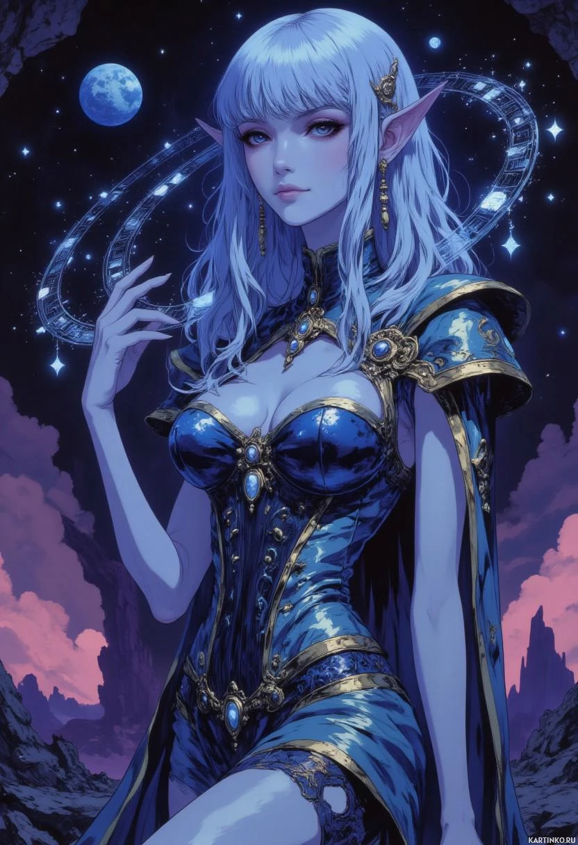 high boots, and what appears to be intricate jewelry or accessories adorning her ears, neck, and hair. The background of the image shows