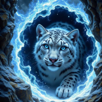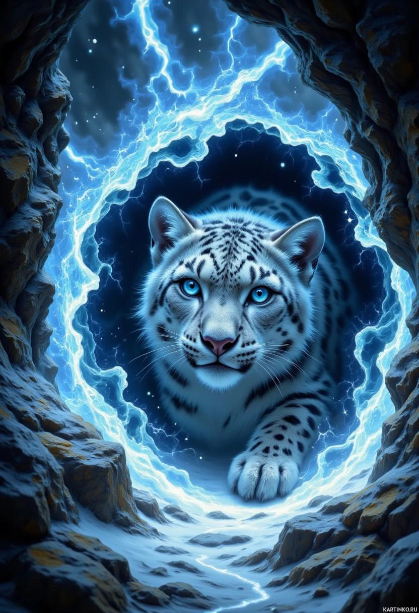 a snow leopard in a dramatic and surreal setting. The cat is perched on what appears to be an iceberg or