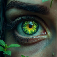 color gradient that ranges from yellow to green, with a central circle that appears black. The eyelashes are long and dark, and
