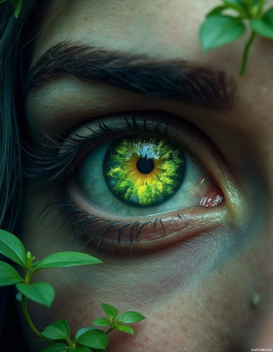 The image features a close-up of an individual's eye. The eye has a striking iris