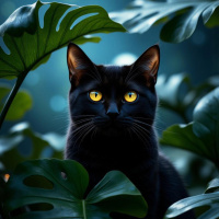 shades of green and brown. The overall atmosphere is serene and somewhat mystical, likely due to the combination of the night setting, the cat's