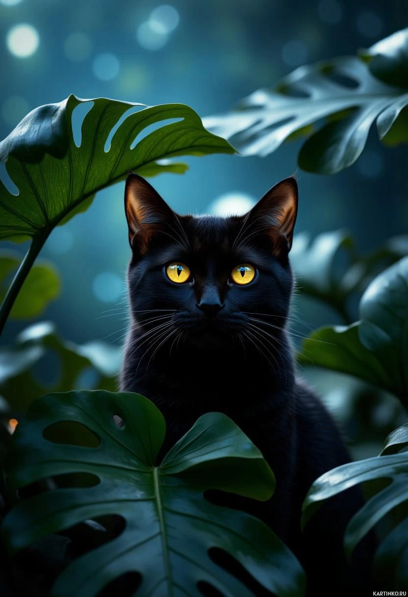 a black cat sitting among green plant leaves. The lighting is low and seems to be artificial, creating