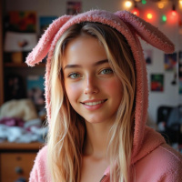 rabbit ears on top. Her style suggests a casual or perhaps playful vibe. The background appears to be