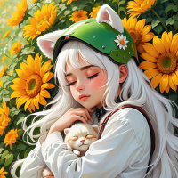 deep thought. Surrounding her are vibrant sunflowers, adding a bright and cheerful atmosphere to the scene.