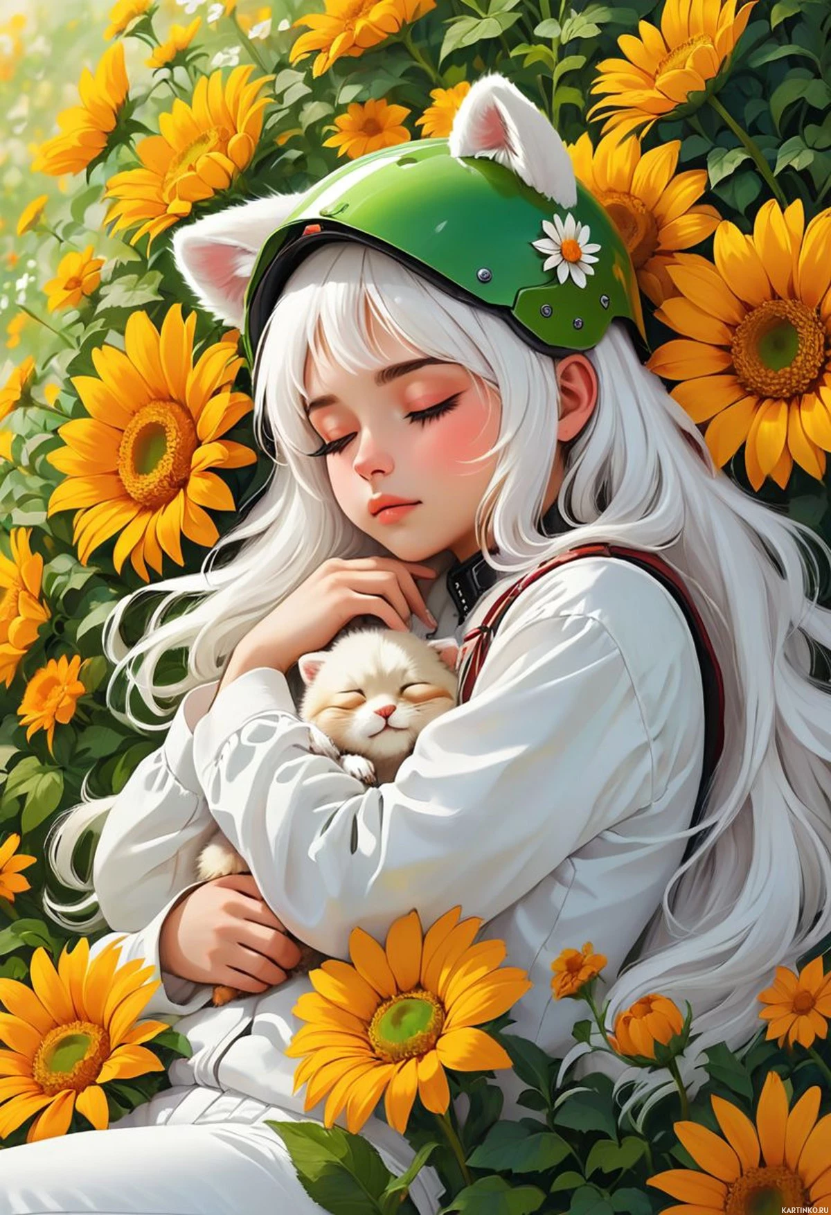 white hair, closed eyes, and holding an orange cat. She is wearing a green helmet adorned with
