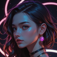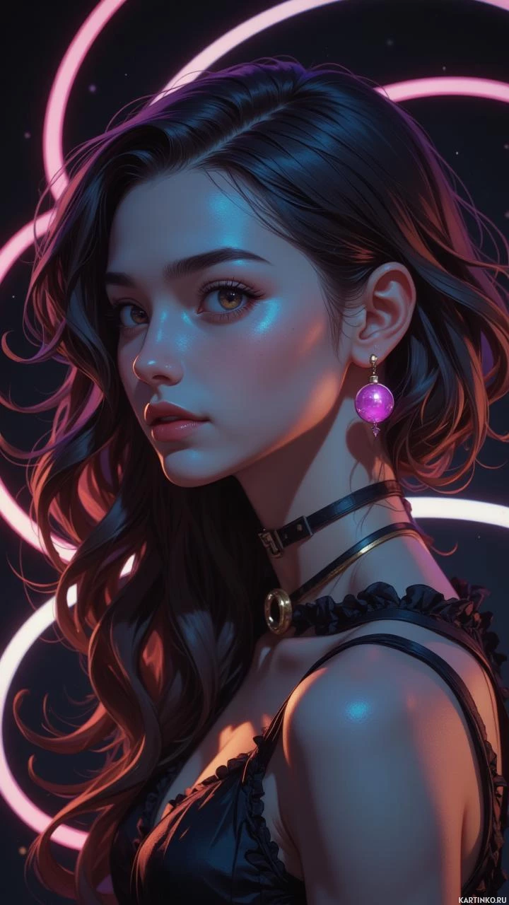neon lights that create an illuminated halo effect around her head and shoulders, giving her an ethereal or magical appearance. These neon lights could be interpreted as stars in a night sky, which adds to the otherworldly quality of the image. The art style is reminiscent of digital art used for illustrations, often found on book covers, album artwork, or promotional materials. It's important to note that no personal information should be inferred from this description based on the provided guidelines and restrictions.